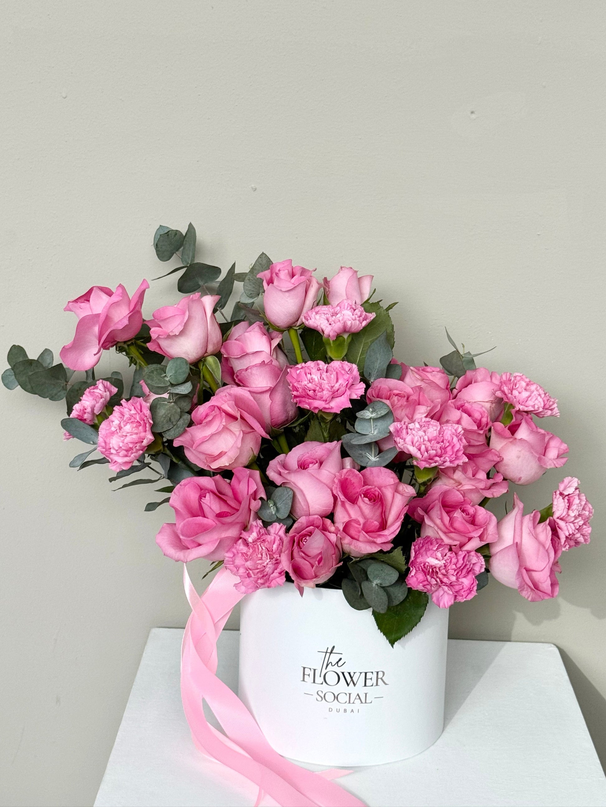 This beautifully arranged box contains a mix of pink roses and carnations, the perfect flowers to express love and appreciation. Luxurious and romantic, this arrangement will bring joy to any recipient.