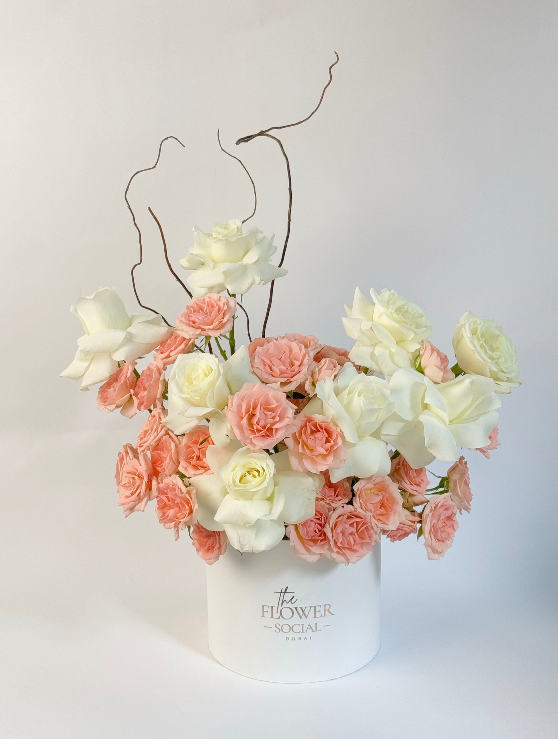 The Rose up Flower Box contains a curated selection of peach and white roses, carefully arranged in a beautiful box. Perfect for special occasions or as a gift to show appreciation and love. Each box is made with the highest quality roses, adding a touch of elegance and luxury to any setting.
